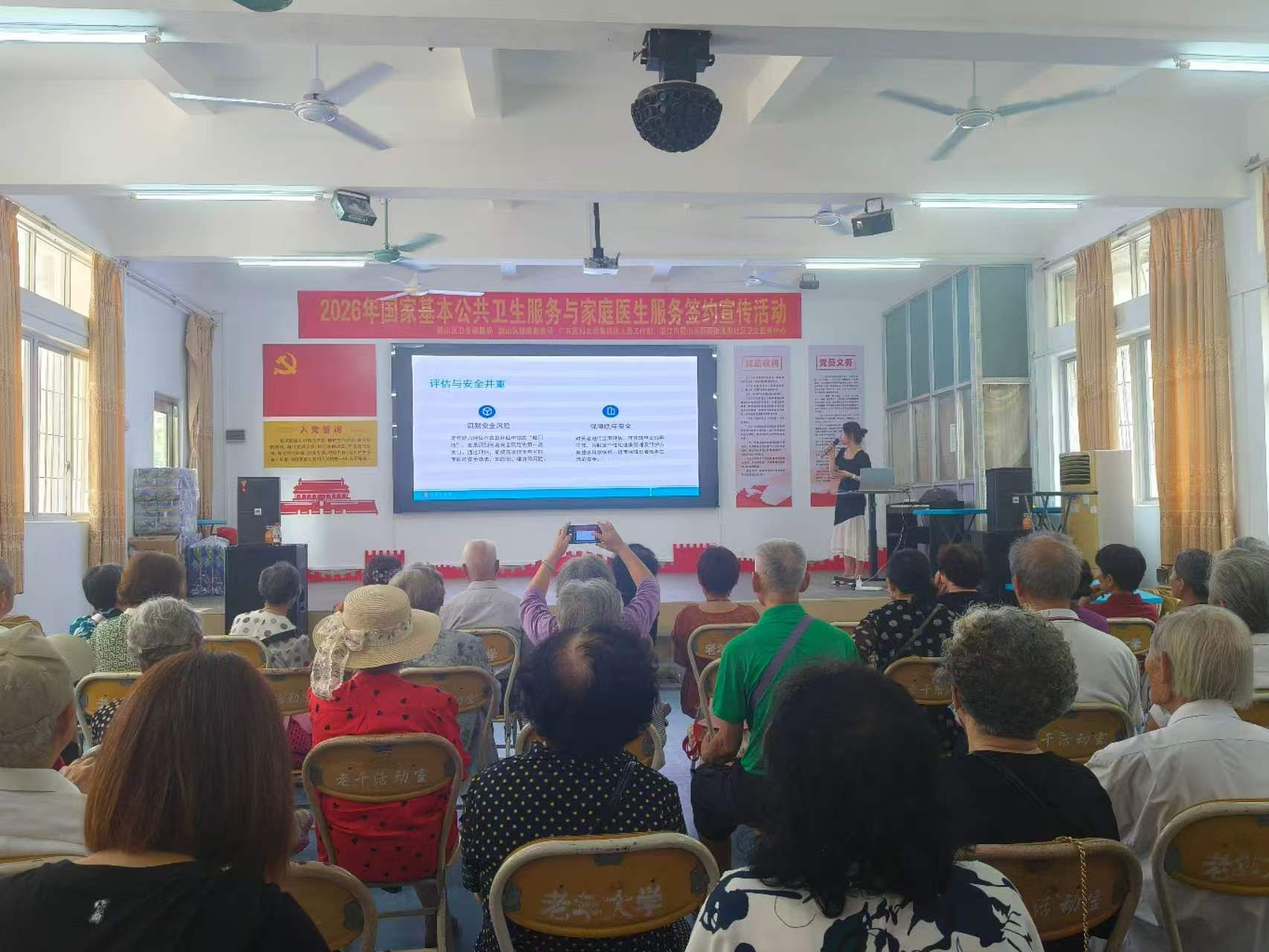 2026 年 4 月 15 日下午,离退休人员工作部联合霞山区卫生健康局、霞山区卫生教育所及霞山区新园街道社区卫生服务中心,在湛江校区老干多功能活动举办家庭医生签约服务暨公共卫生服务宣传活动,面向老同志普及健康知识、解读惠民政策,切实解决失能老同志看病难、评估难等实际问题。